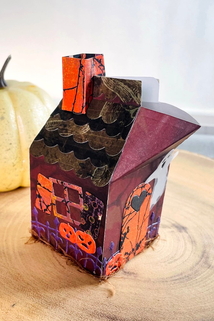 Although the milk carton die is easy to assemble, and the house embellishments are simple and fun, once you add the Halloween card stock and spooky embellishments, this turns into a real surprising treat box.