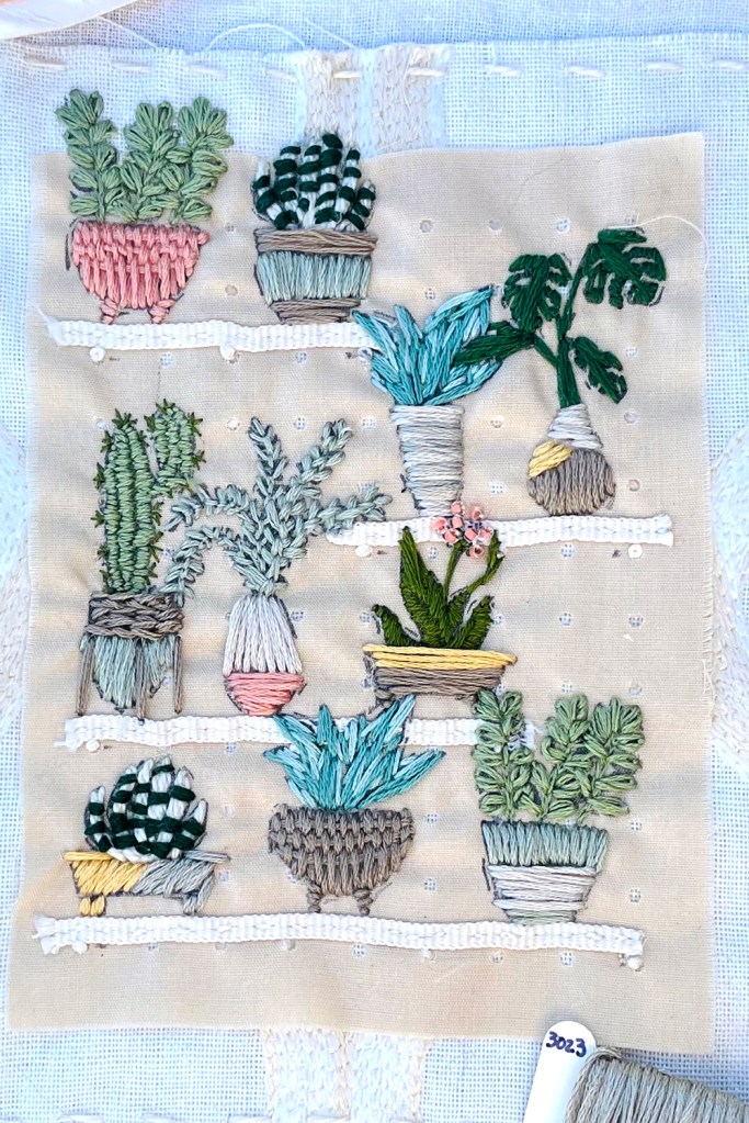 - Embroidery Floss: DMC 522, 524, 580, 642, 676, 712, 758, 3023, 3033, 3345, 3364, 3813, 3816