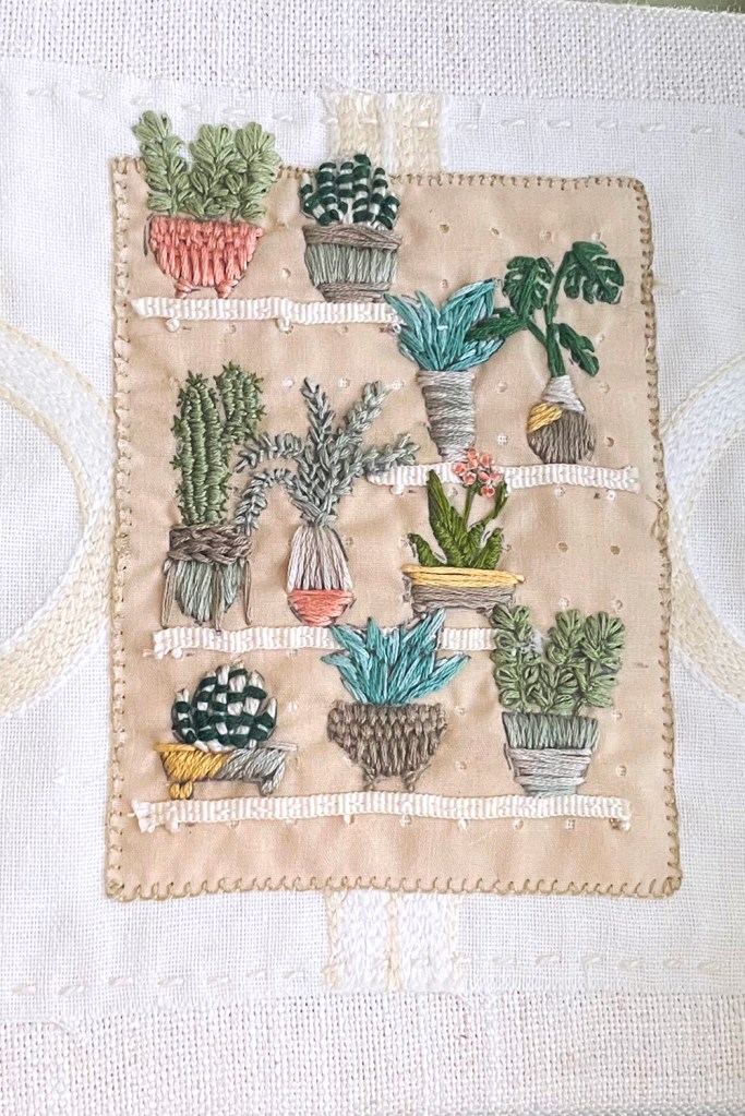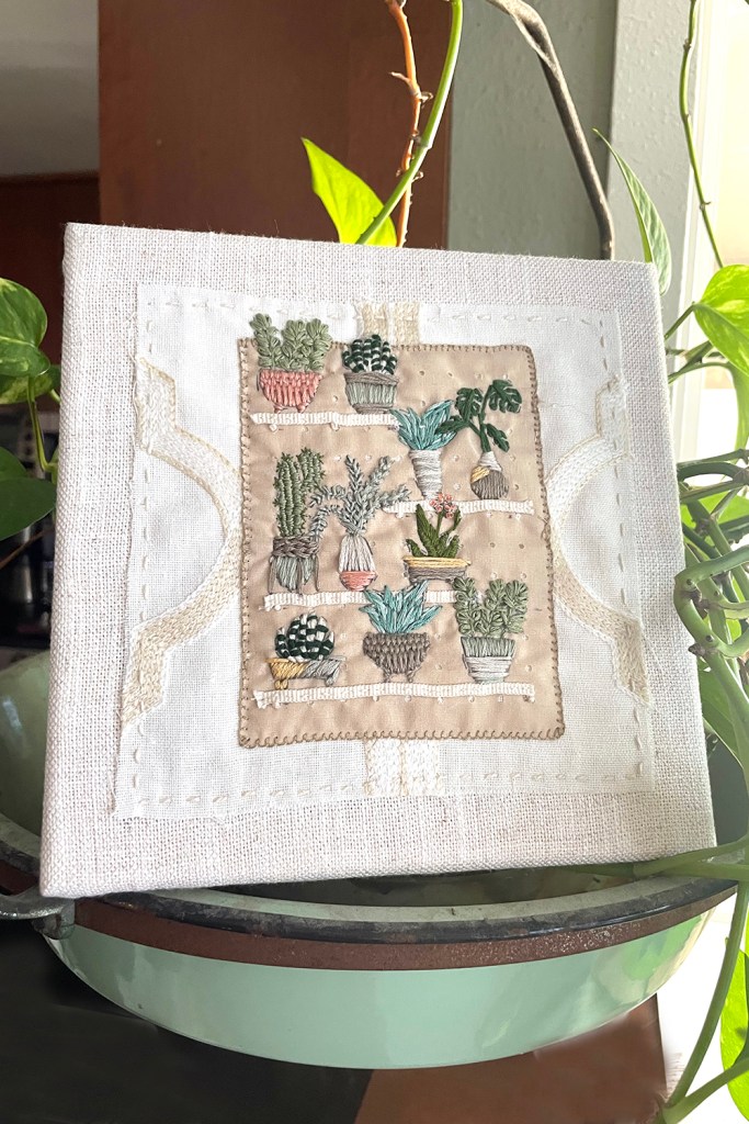 I started this project while in my studio then took it on the road to work on the stitching while glamping. While “roughing it” in the “wilds” I had a problem with the background fabric being too soft and stretchy so the stitching created wrinkles. Unfortunately, I could not fix this without the proper tools so I just stitched what I could. Now I am back in the studio with all of my supplies. I wanted to share how I fixed the problem of the saggy background fabric on the stretcher bars. I learned that relaxing and enjoying what I was doing without worrying about what I couldn’t change at the moment made this project a good lesson.