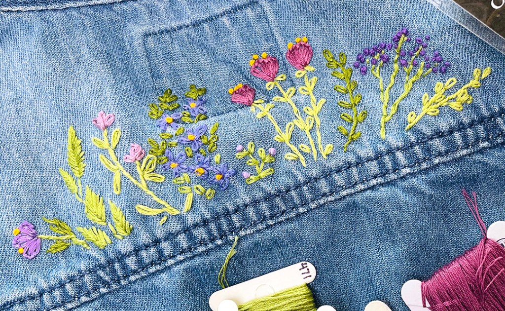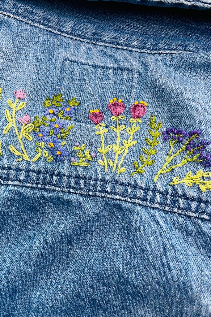 This was filmed while glamping so the relaxation was even better with the slow stitching. I only used six simple stitches on this adorable thrifted child’s denim jacket.