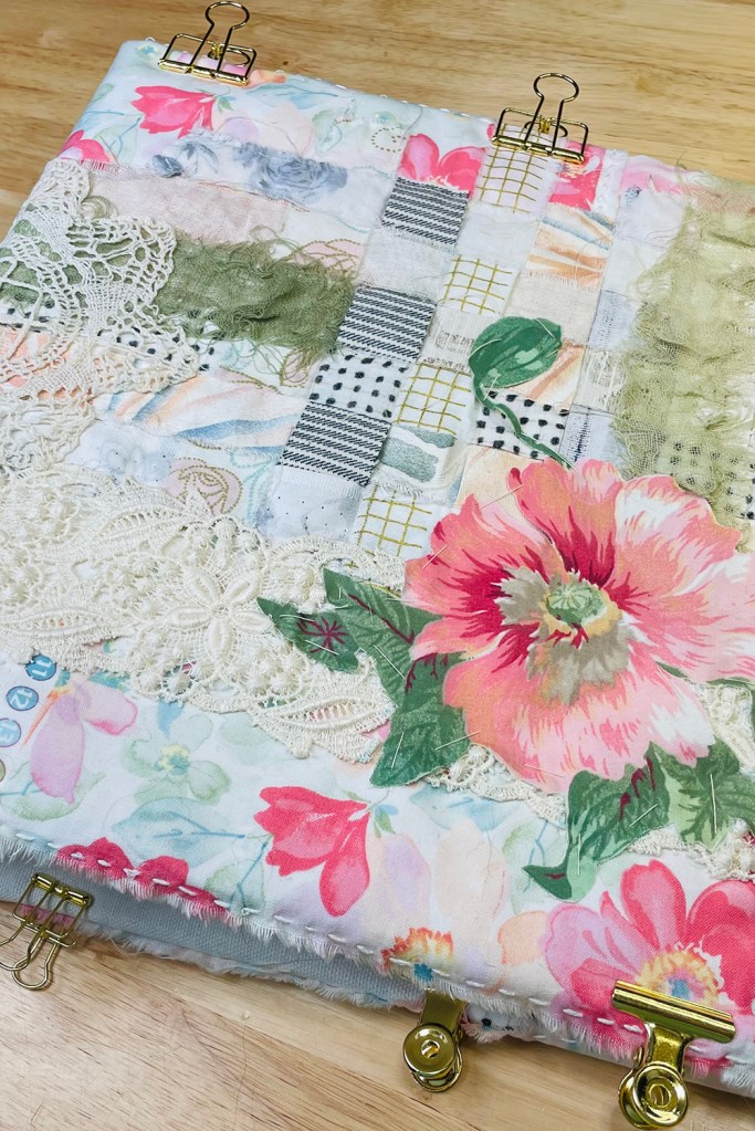 - Fabrics: Background fabric enough to cover notebook, scrap fabric for embellishing
