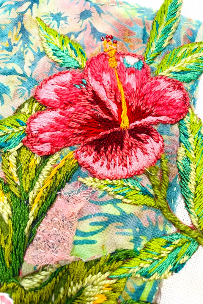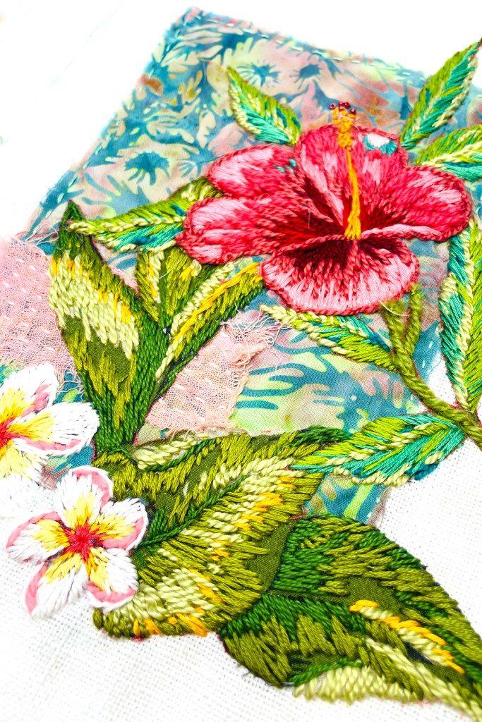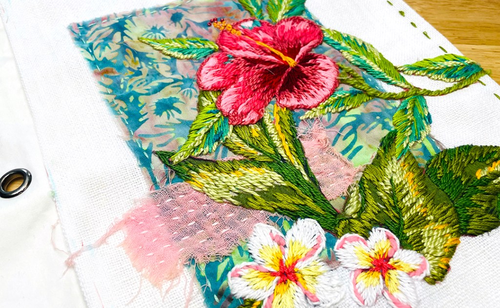 In part 2 of my Hawaiian shirt stitching project I’ll show you how to combine different fabrics and fibers to create a piece of textile art bursting with colors and textures. Plus I completely redesign flowers from one shape and color into lovely Plumeria blossoms. Learn how to add personalized stitches, layer textures, and use recycled fabric in this creative stitchery project