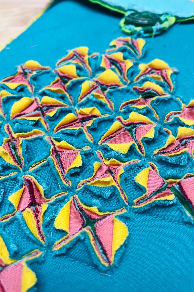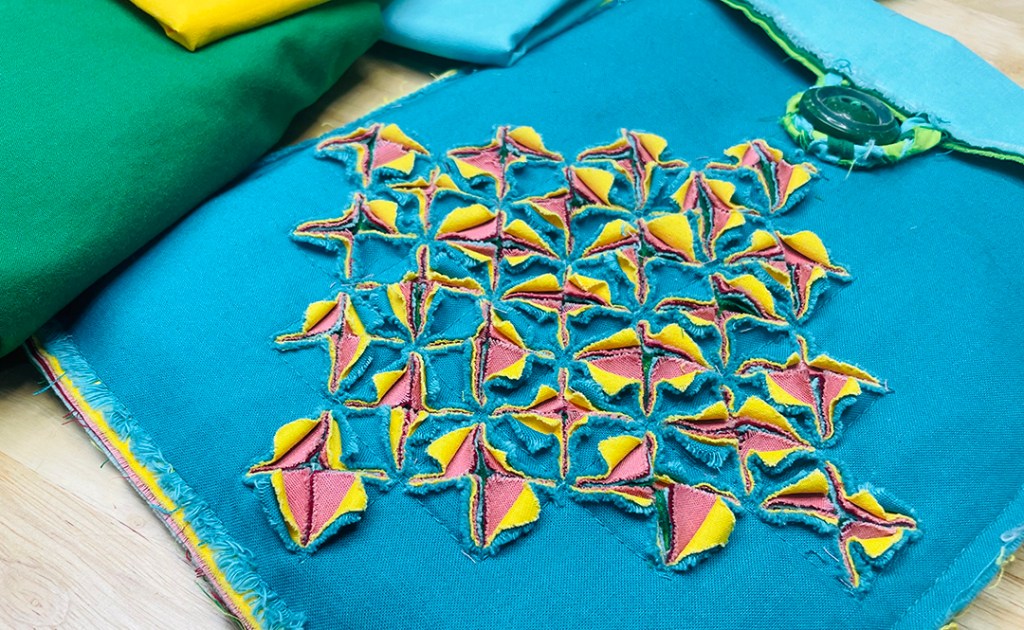 Ready to transform 100% cotton textiles into a one-of-a-kind, functional and practical piece of art? In this tutorial, I will show you how to sew a Chenille-style Bloomin’ Bag—a vibrant, blooming fabric bag that can hold your iPad or other essentials in a mindful and creative style. This simple sewing project uses lots of layered cotton fabrics and easy machine stitching to create a textured, blooming effect that’s perfect for beginners and experienced textile artists alike.