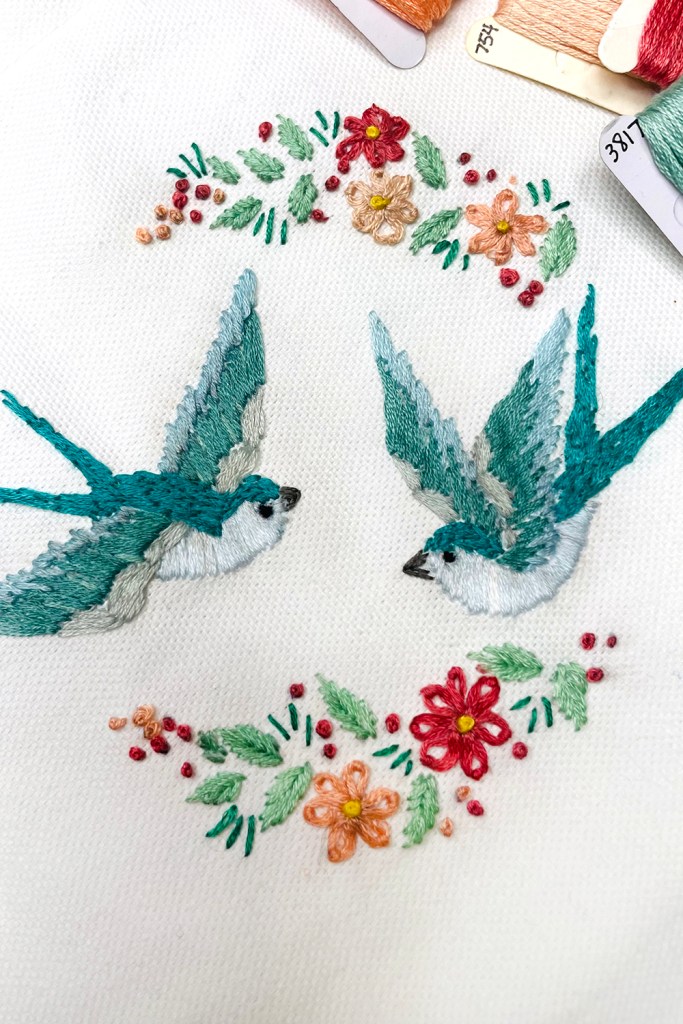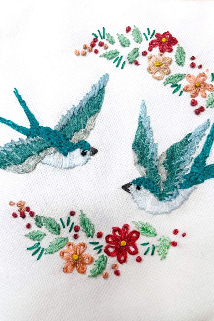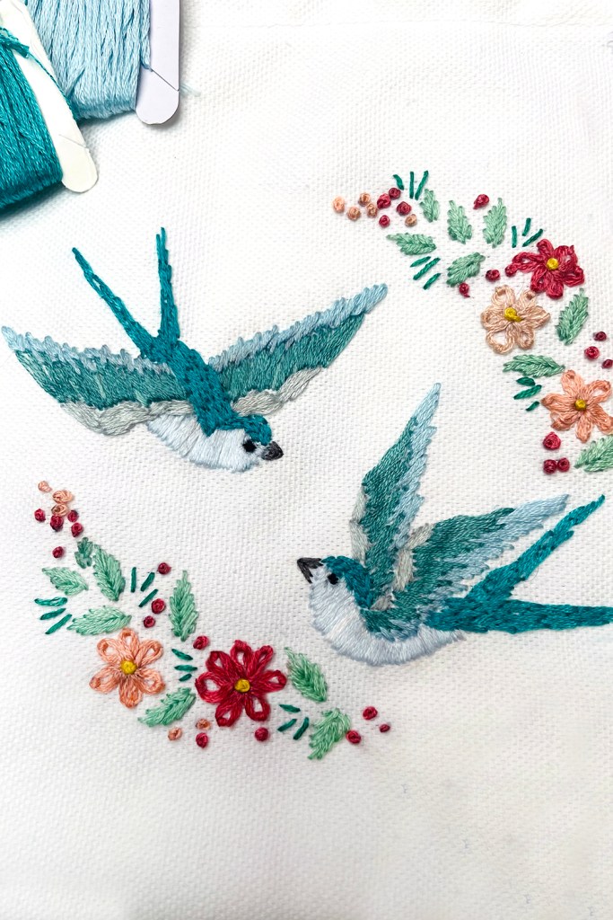 Well, I hope you enjoy these sweet Swallows and petite flowers. Although I love the look of them on this canvas tote, I suggest stitching on softer fabric, it will be easier on your hands.
